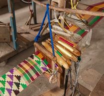 This is the kente loom. For Ewe kente it is made out of wood. In small villages people often use the wood which is laying around to construct the loom. This is the cheaper for them because they need less money to start... Read More